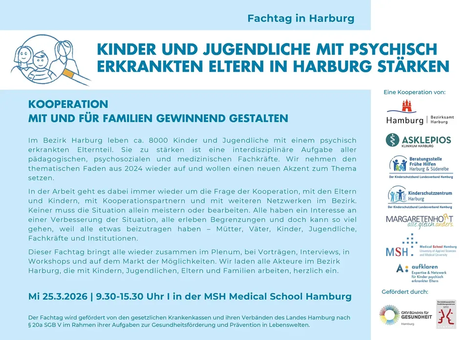 Im Bezirk Harburg leben rund 8.000 Kinder und Jugendliche mit einem psychisch erkrankten Elternteil. Sie zu unterstützen, ist eine gemeinsame Aufgabe aller pädagogischen, psychosozialen und medizinischen Fachkräfte.